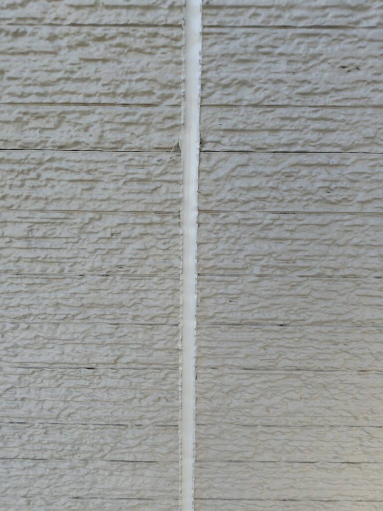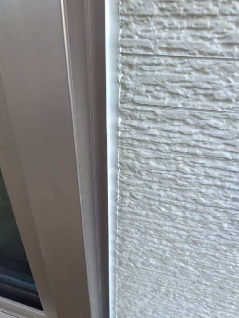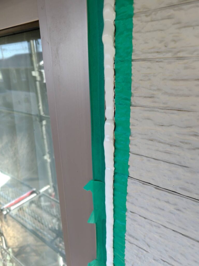 テープを剥がすと、真っ直ぐで美しいラインのシーリングが現れます。サッシとの境界線も隙間なく埋まり、これで雨水の浸入をシャットアウトする強固な壁が完成しました。