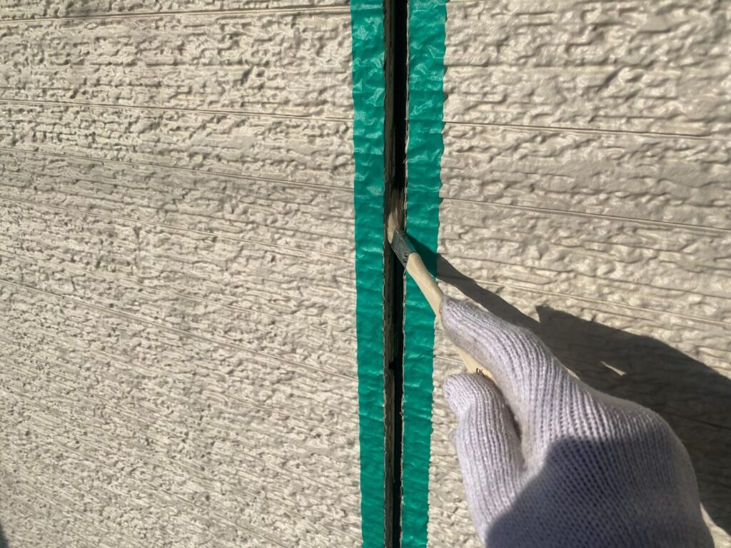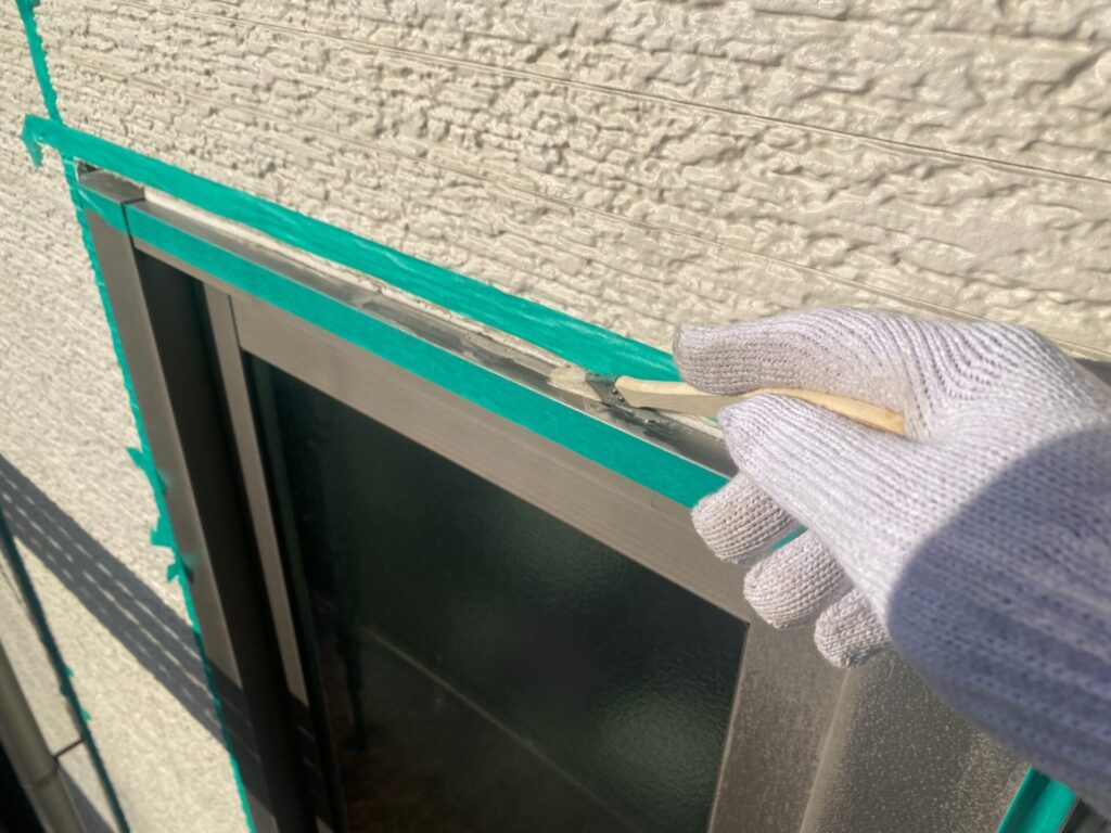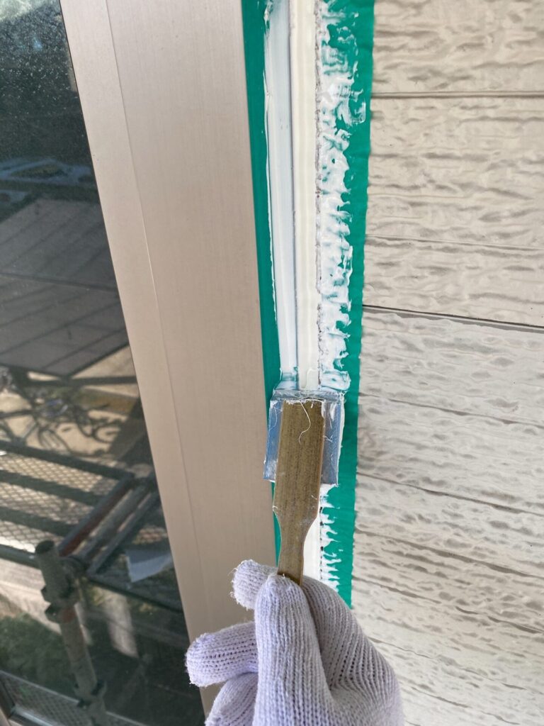 サッシ周りや目地の奥まで、専用の刷毛で塗り残しがないよう丁寧に作業します。この工程が、数年後の「剥がれ」を防ぐ最大のポイントです。